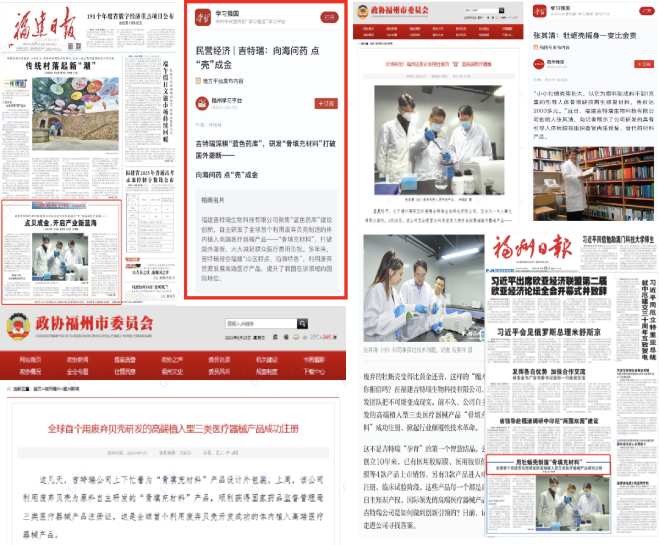 目前,我國骨修複材料行業的市場規模近百億元,但市場仍以進口産品爲主。2019年我國種植牙市場規模約爲135億元,進口種植體市場份額約80%。使用質量不亞于進口産品的國産“骨填充材料”将降低國人醫療費用。該産品的面世引起了政府和社會的轟動,包括中共中央宣傳部“學習強國”,福建日報、福州日報等十多家媒體争相報道該喜訊,醫療器械商業評價:“正當所有械企對如何實現技術創新一籌莫展的時候,有人卻憑借着小小的牡蛎貝殼,研發出了體内植入的高端醫療器械産品,摘下了全球第一的桂冠,迎來了行業颠覆式的技術革命”,報道僅僅短短的幾十天,閱讀原文就超過2.3萬人次,創造單一産品報道閱讀量曆史記錄。許多醫療機構上門尋求合作或供貨,産品尚未銷售,預定訂單暴增。